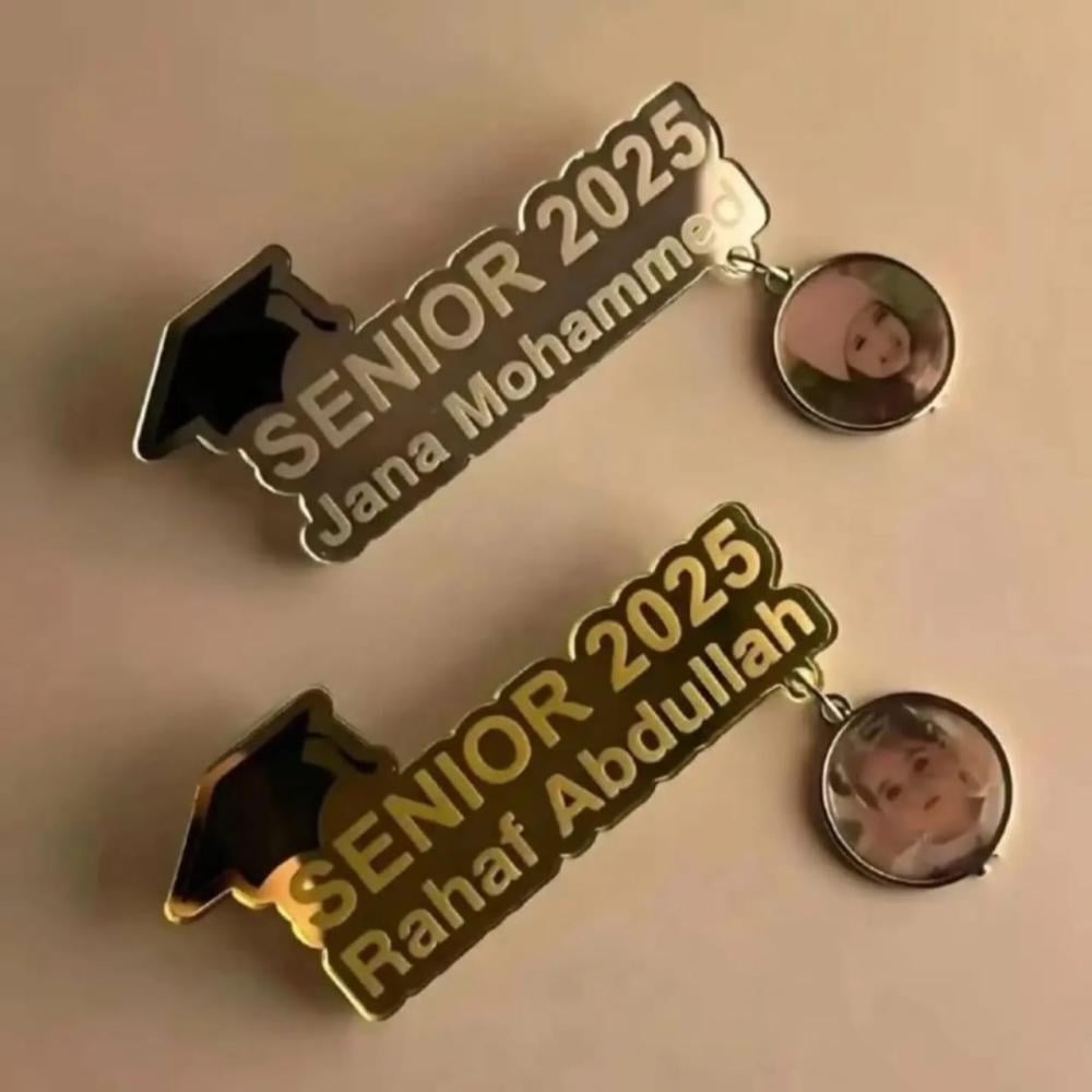بروش تخرج أطفال سينيور باسم وصورة داخل ميدالية فخمة. تصميم حسب الطلب وتغليف أنيق. هدية تخرج لا تنسى!